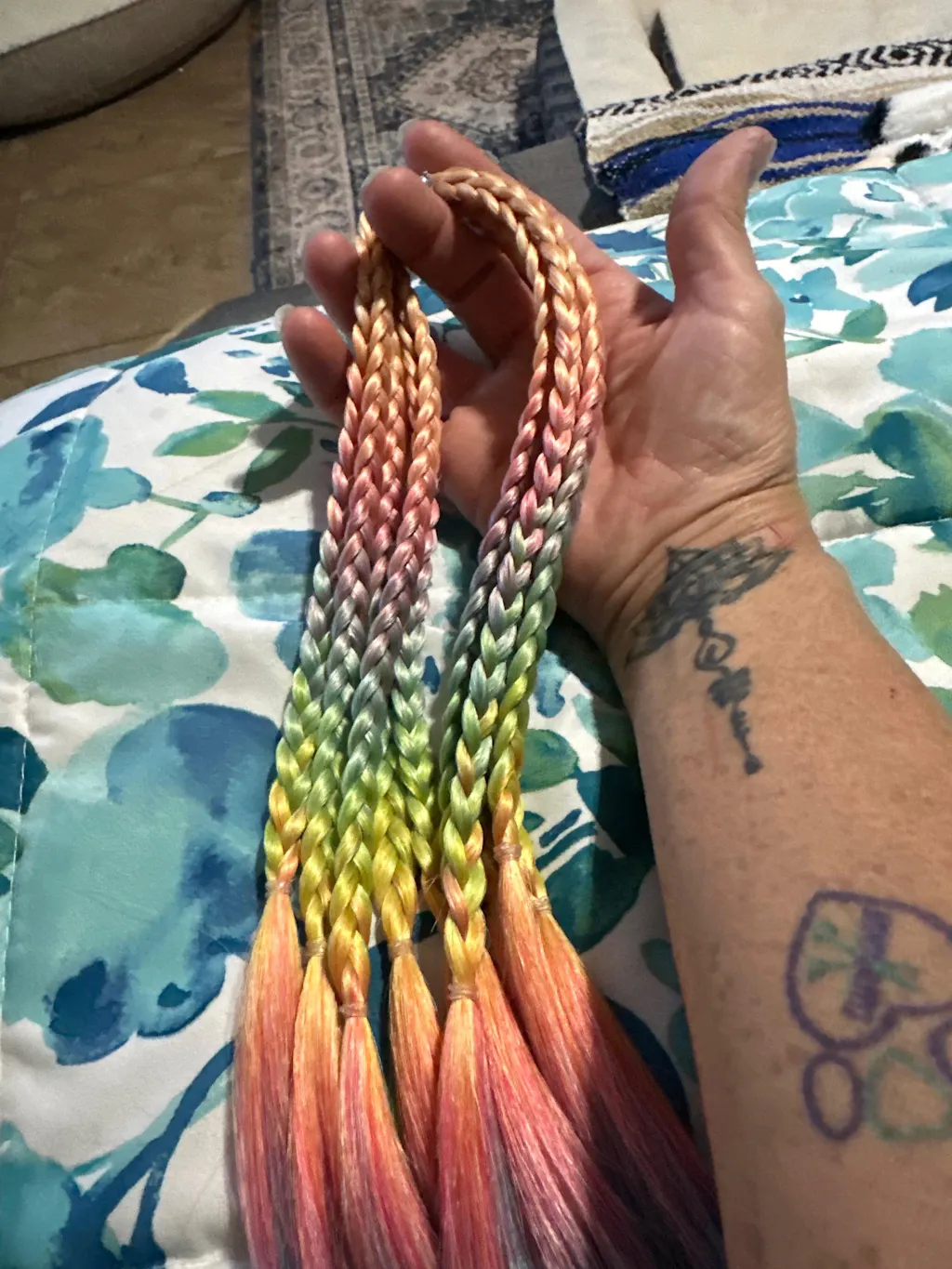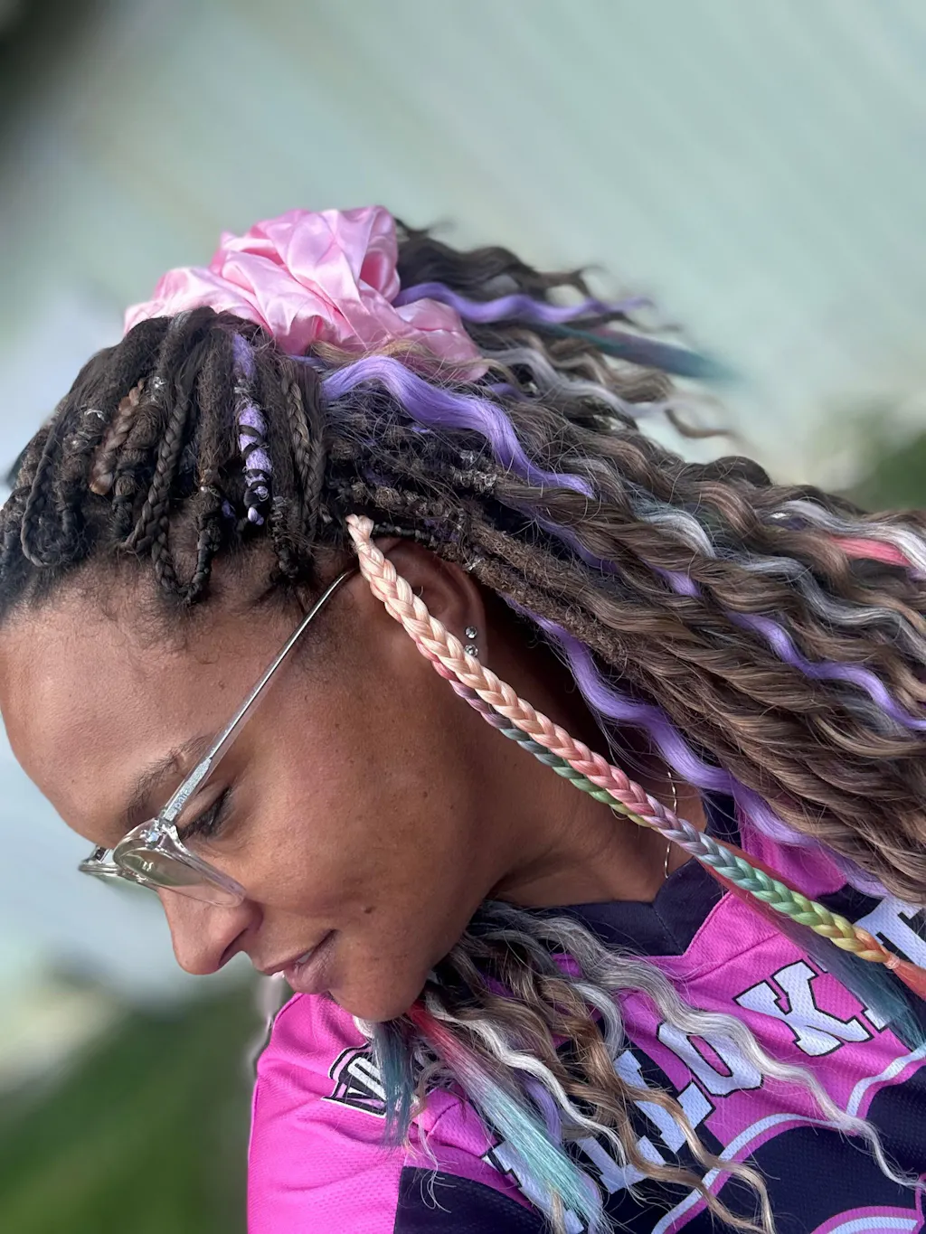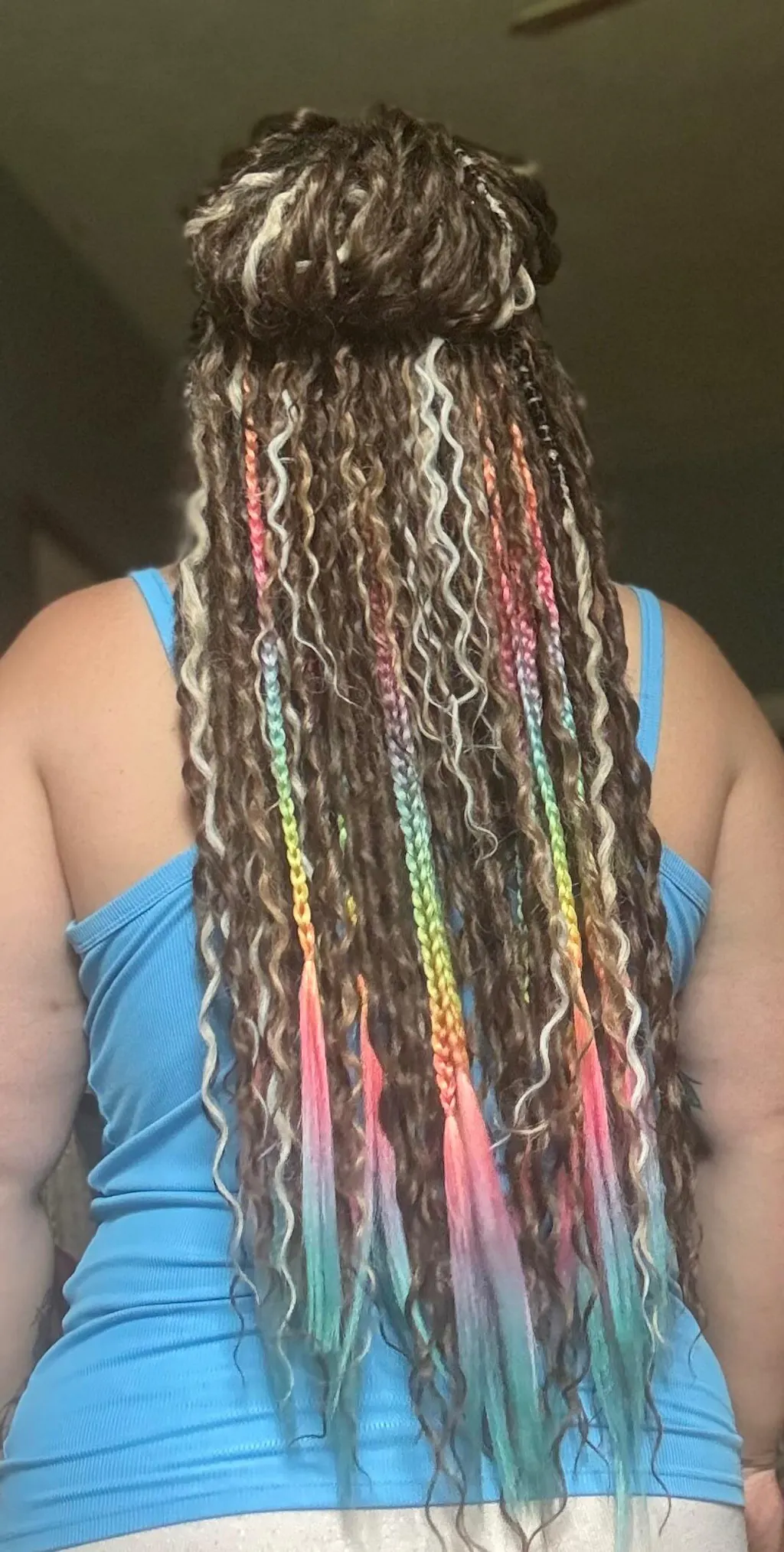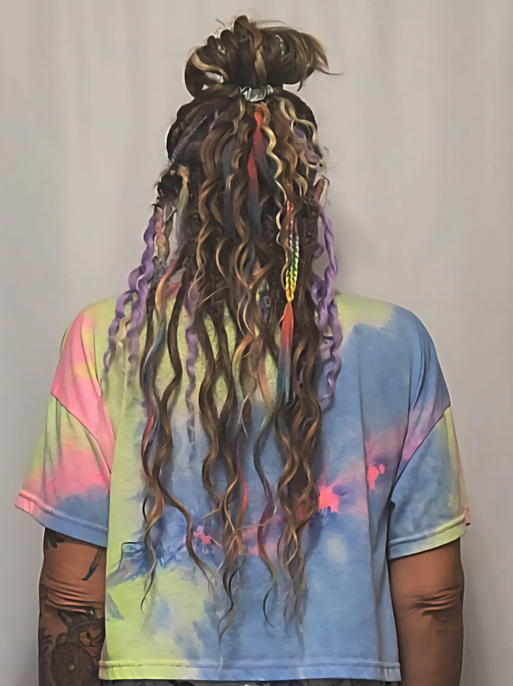 Prism is a full spectrum of color in synthetic dreadlocks—like sunlight bursting through glass and scattering into every shade of the rainbow. From root to tip, each braid shimmers with radiant hues that shift and glow, making Prism the boldest, brightest expression of pure color.