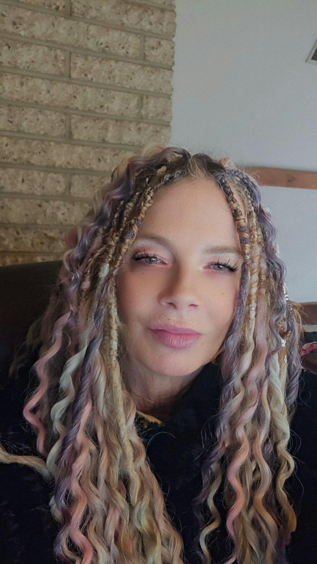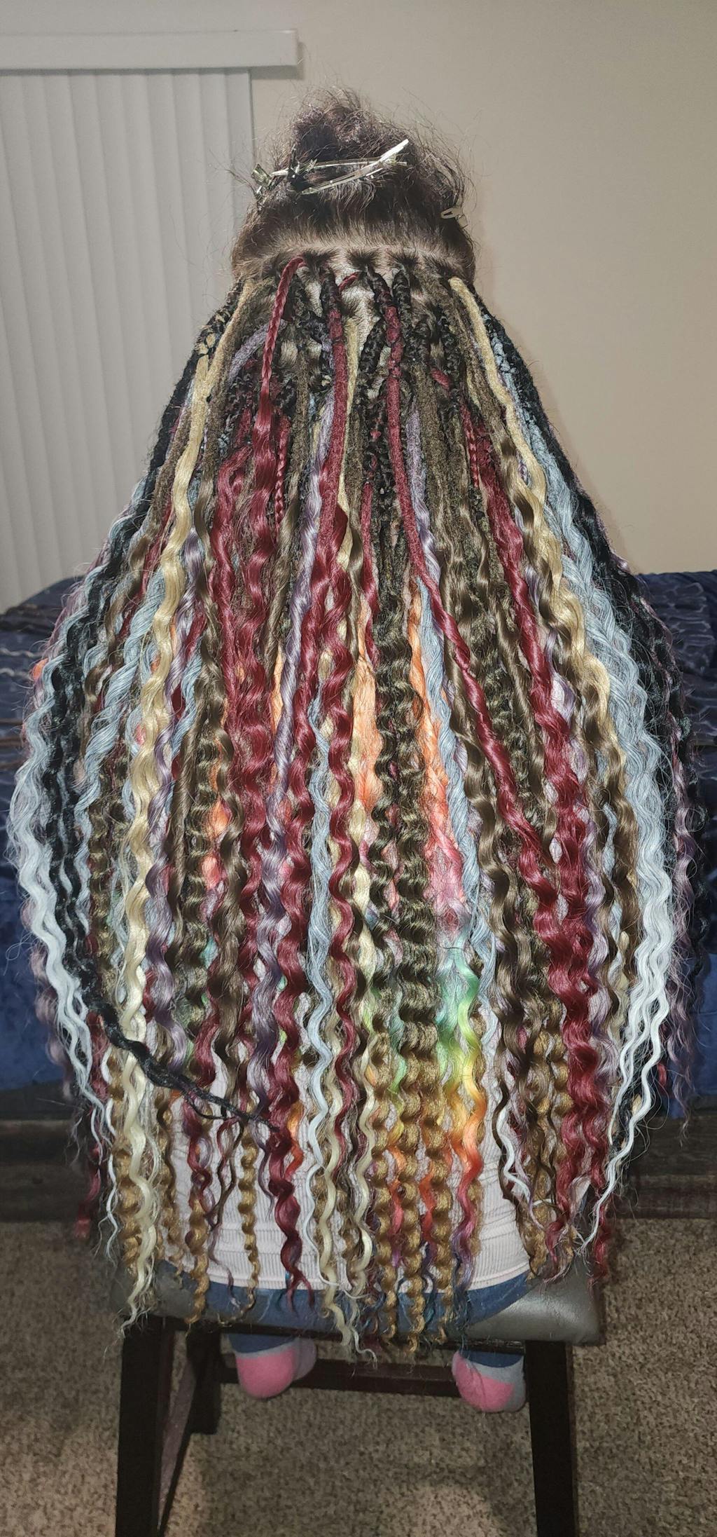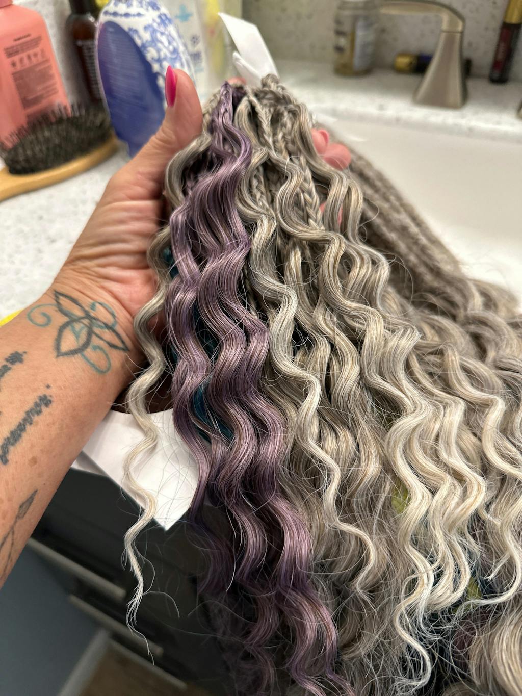 Each bundle carries its own gentle variation, blending tones that shift with mood and motion. Whether worn as a full transformation or woven into existing braids, Wisteria feels like serenity made visible—luxurious, flowing, and endlessly expressive.