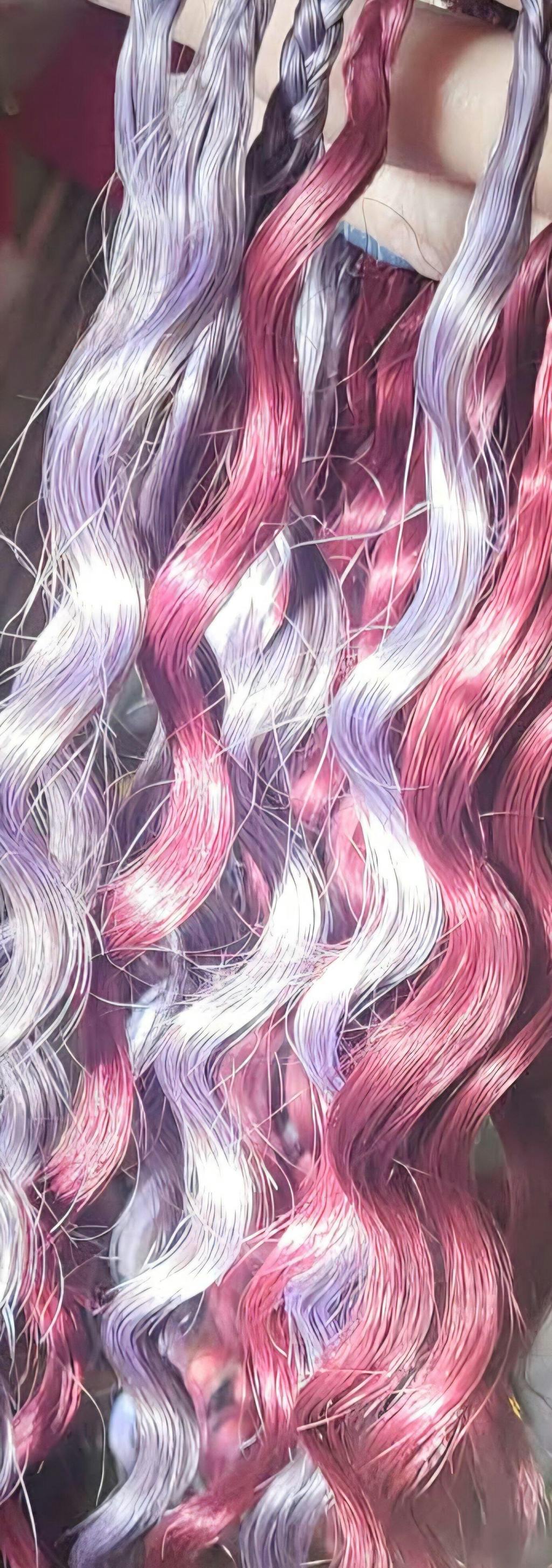 Wisteria drapes in delicate waves of dusty lavender, hazel, and white—each strand a soft translation of twilight light. Her fibers shimmer subtly, shifting between silken violet and muted smoke, creating a tone that’s both grounded and dreamlike. The color deepens as it moves, like dusk descending over a quiet field of blooms.