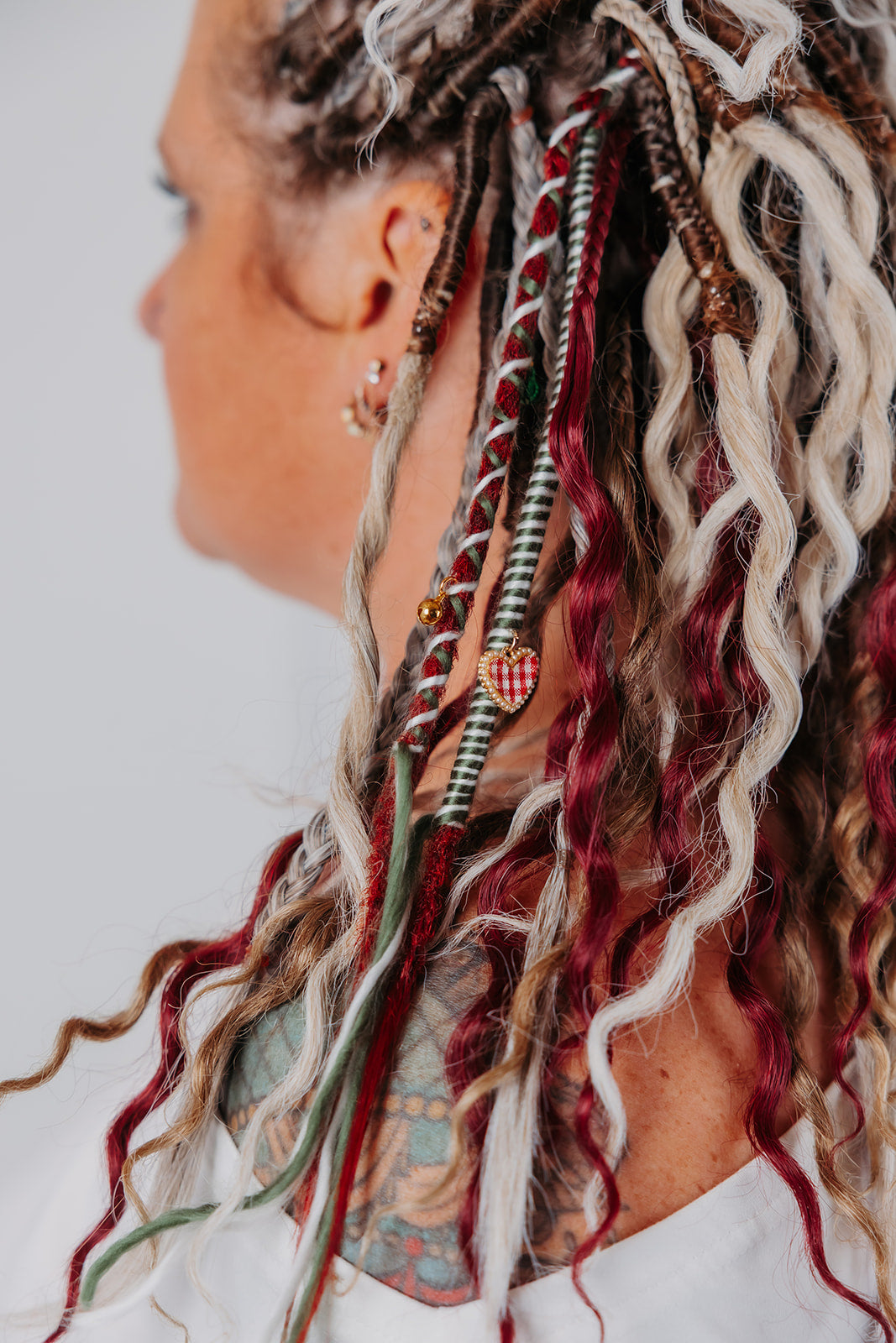 Plaid heart charms glimmer gently along her braid, each one a tiny echo of handmade gifts and home-baked love. Merry is more than an accessory—it’s the feeling of laughter in a kitchen filled with cinnamon and song.