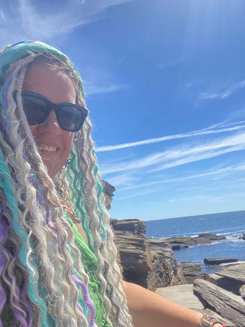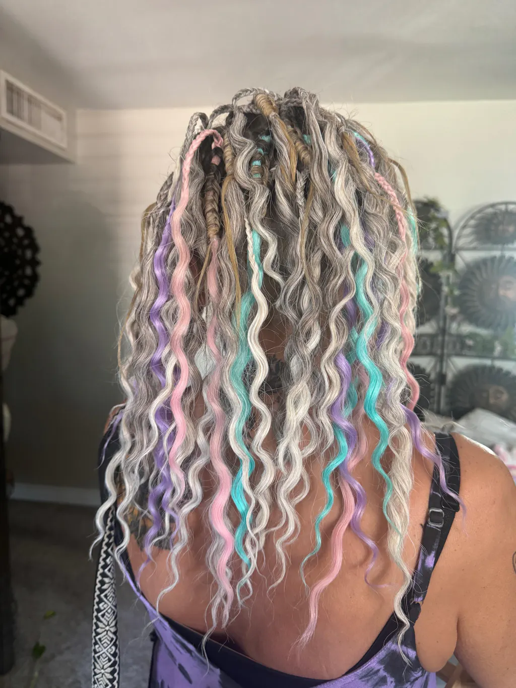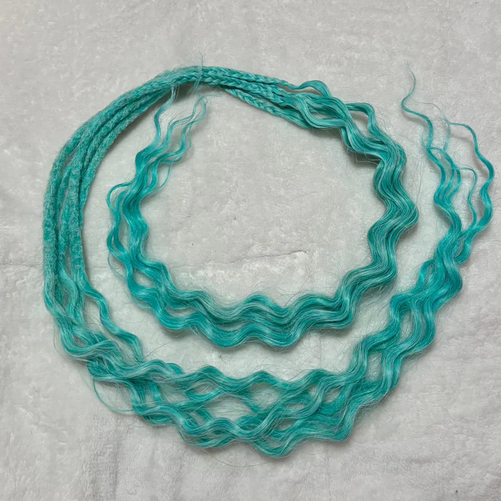Aurora is a spellbinding sweep of luminous teal in synthetic dreadlocks—cool as glacier melt yet alive with the shimmer of dawn. Each sculpted wave reflects light like ripples under the Northern Lights, giving your hair a liquid-emerald flicker from root to tip. Wear her when you’re ready to radiate fearless confidence and let the world feel your electric calm.