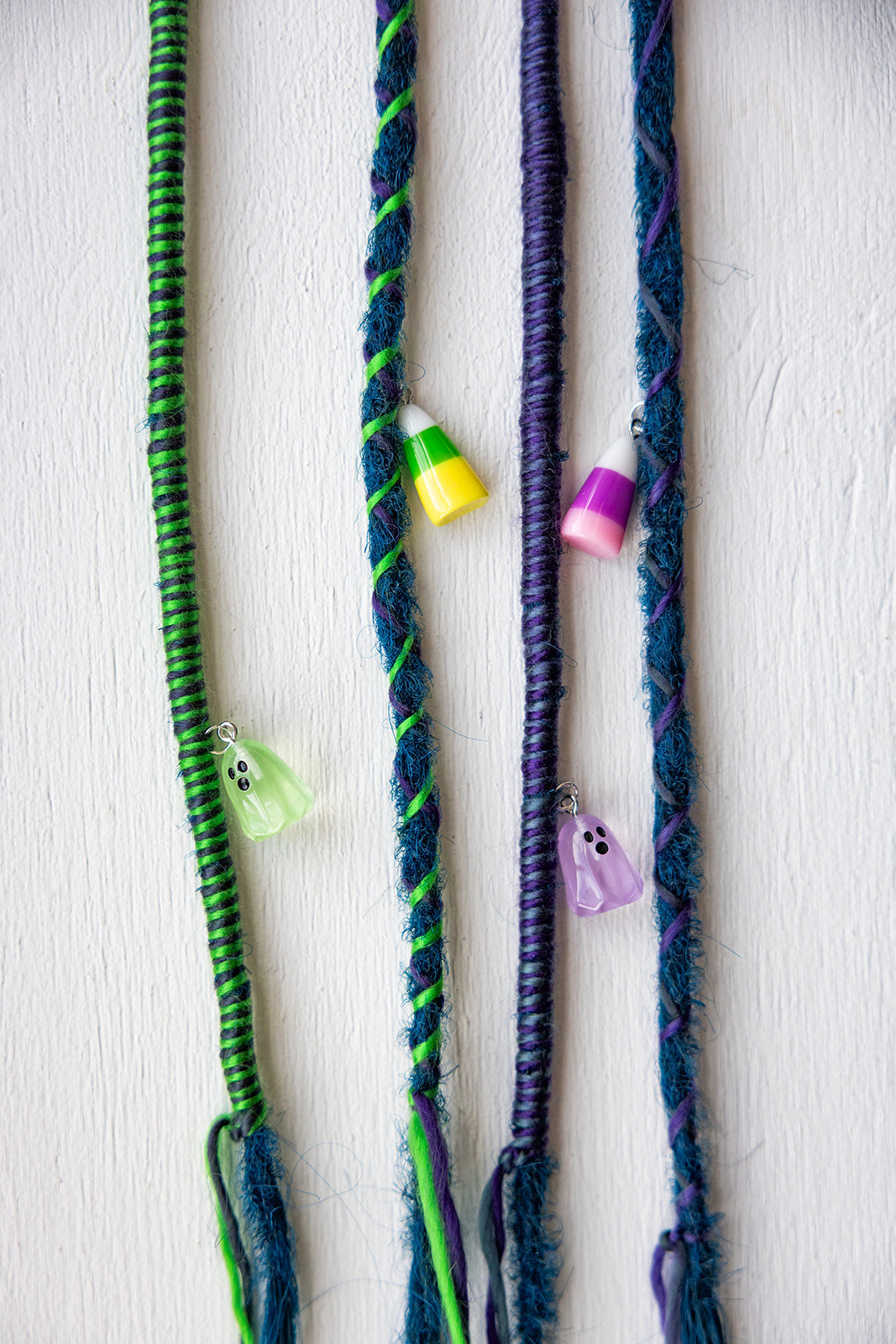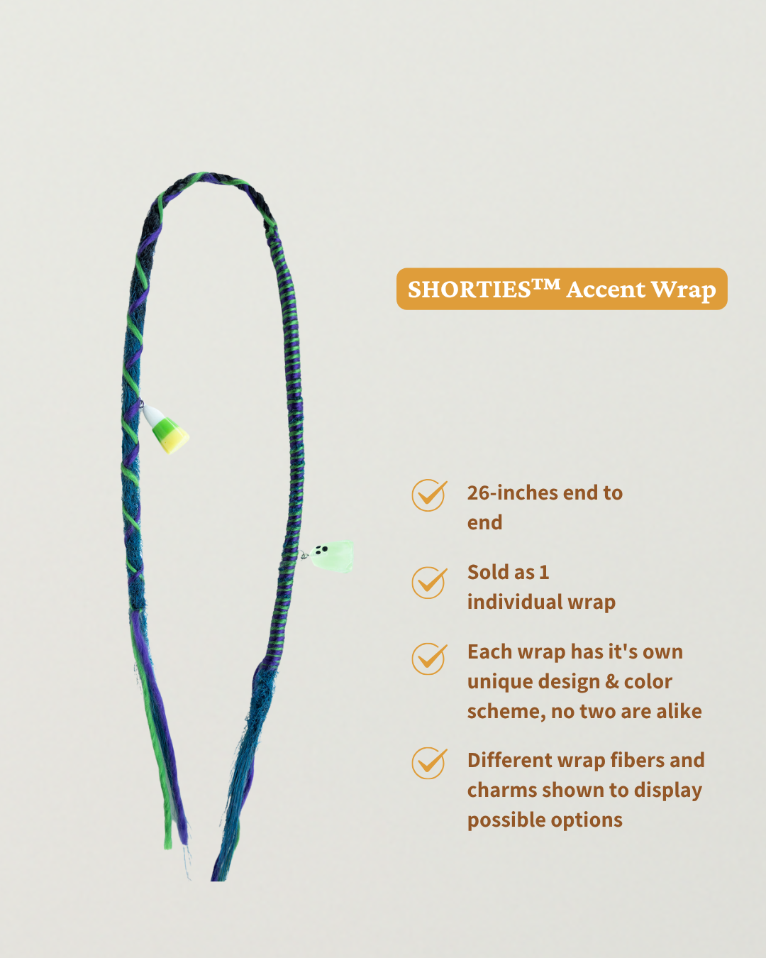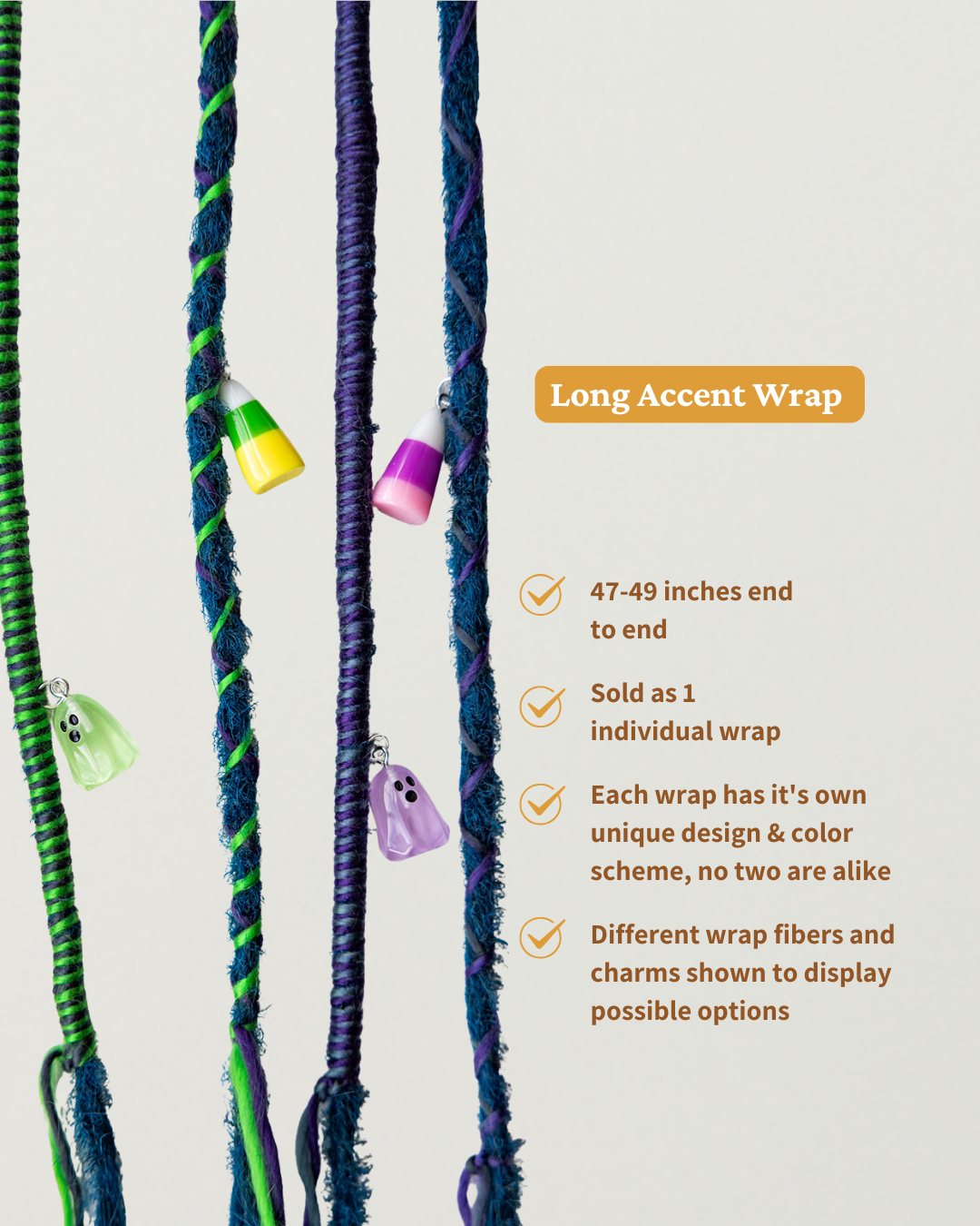 Each wrap in this collection is unique—charms and fibers vary, making every piece one-of-a-kind.