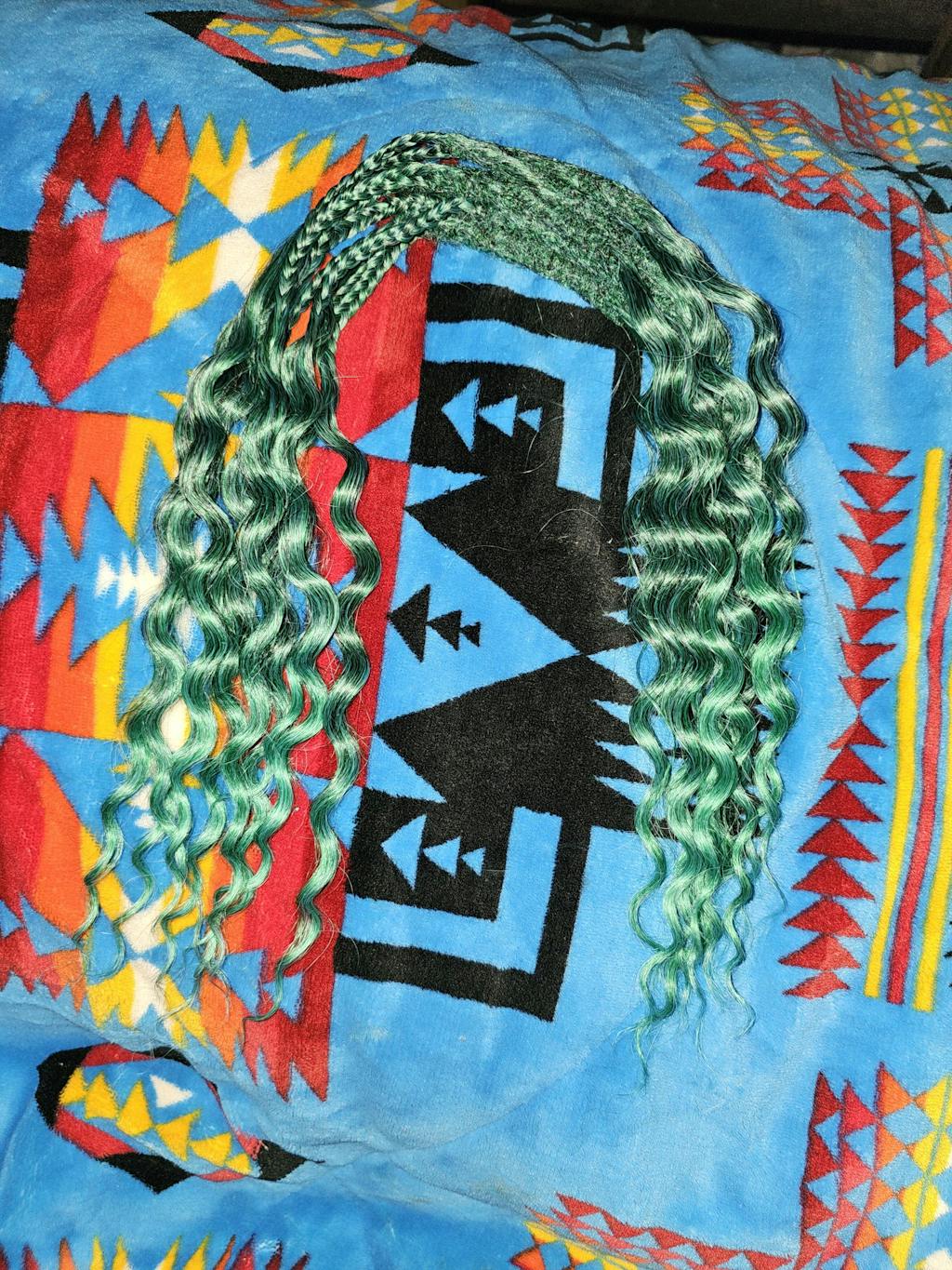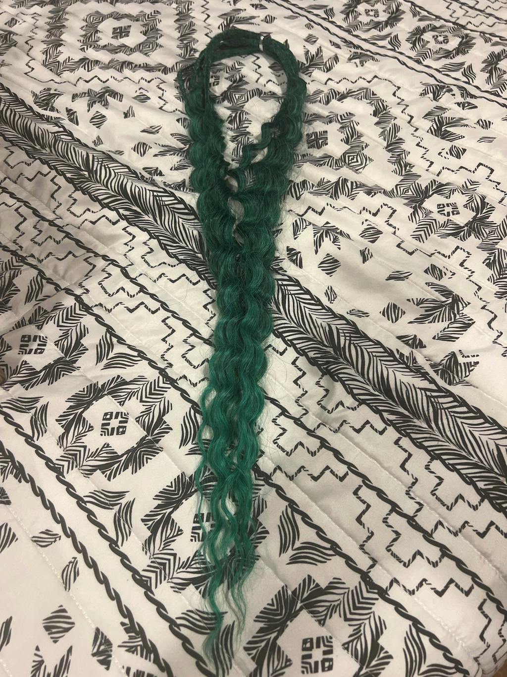 Emerald is a deep, jewel-toned green in dreadlock extensions that ombrés into a softer shade, layered with darker undertones that give her soul-rich depth. She’s lush, dimensional, and endlessly captivating—like a gemstone catching the light.