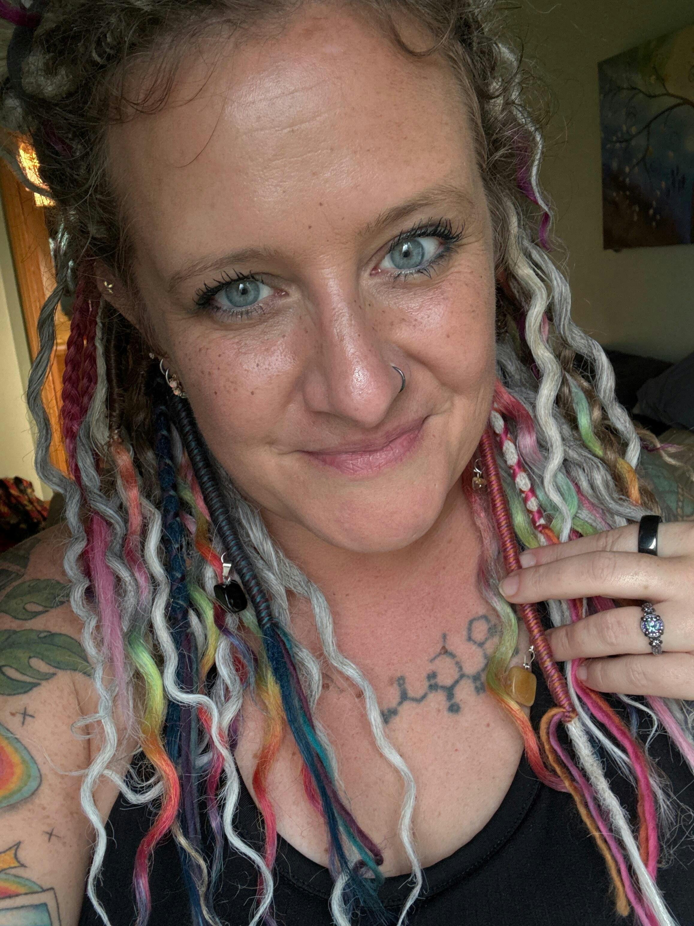 Meet Roxie: the life of the party in your hair! Wrapped on a Polar base, she shines with playful energy and vibrant fibers. Each Roxie wrap comes with its own unique charms and color story, so no two are ever exactly alike.