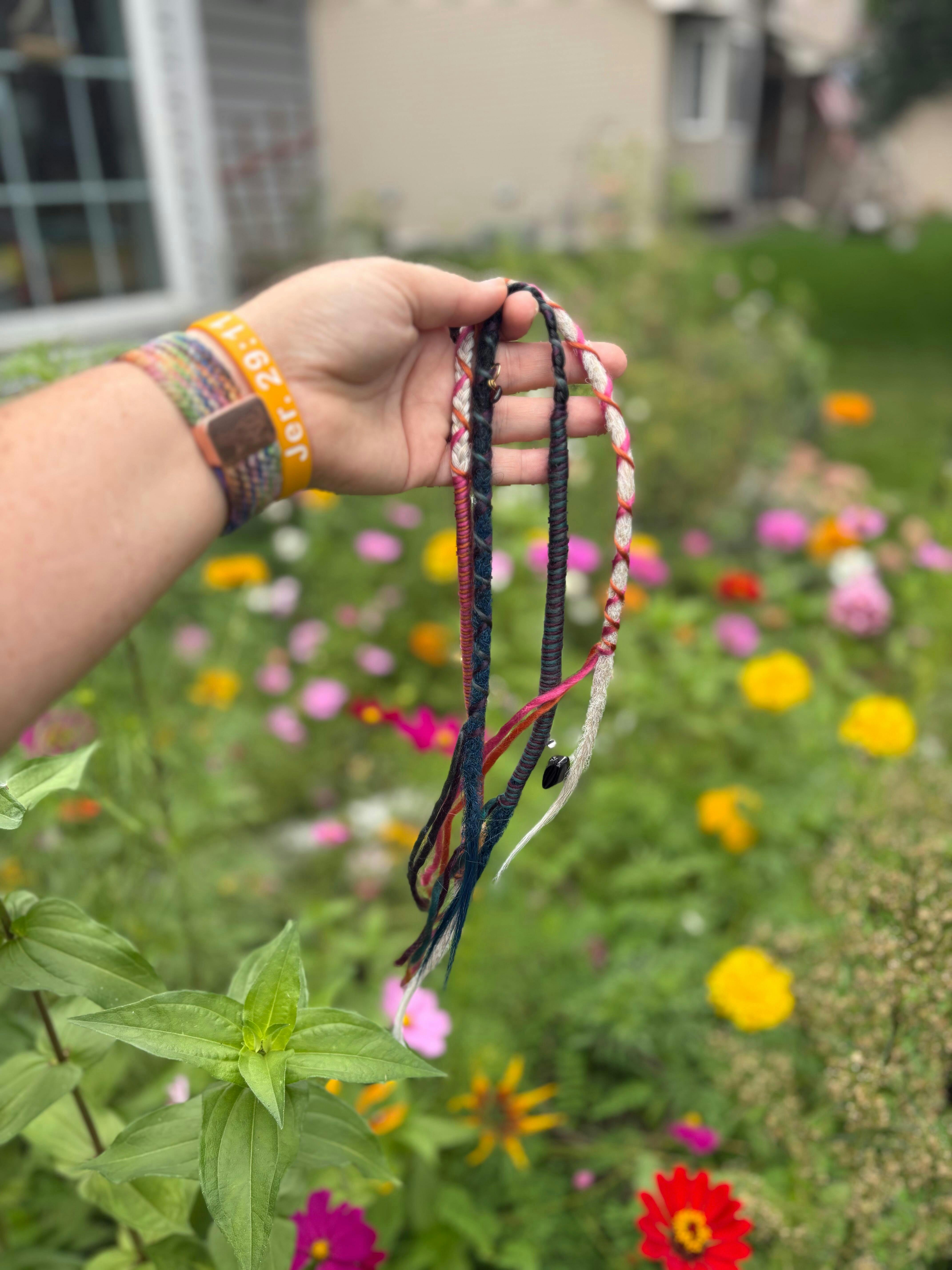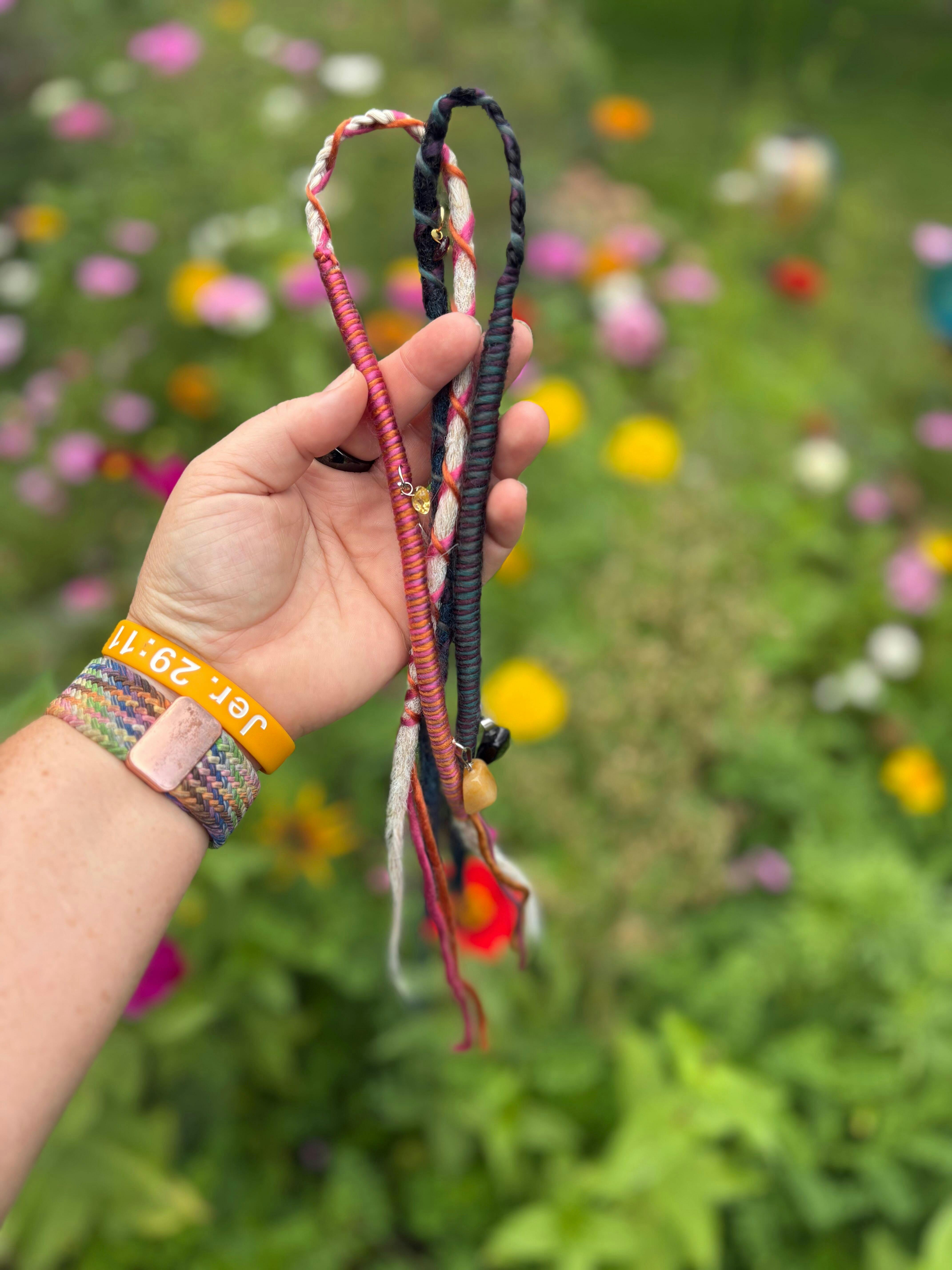 Each wrap in this collection is unique—charms and fibers vary, making every piece one-of-a-kind.
