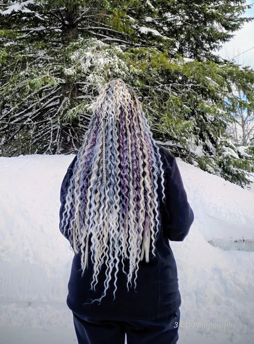 Each bundle carries its own gentle variation, blending tones that shift with mood and motion. Whether worn as a full transformation or woven into existing braids, Wisteria feels like serenity made visible—luxurious, flowing, and endlessly expressive.